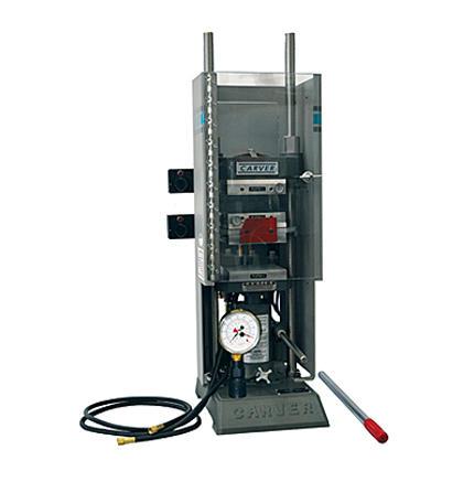 Manually operated hydraulic laminating presses with stacked heating and cooling platens in bench top model. Thermostatic control, aluminium platens, heating one opening while simultaneously cooling the other results in faster production of laminated samples, plastic plaques and other R&D items. Temperature control 150-500°F (Shown with analog gauge)