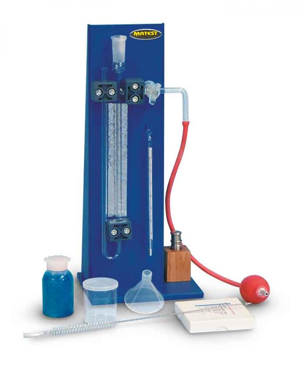 The apparatus is supplied with a glass U-tube manometer with valve, steel stand, test cell with disk and plunger all in stainless steel, rubber aspirator bulb, 1000 filter paper disks, manometric liquid, vaseline grease for better coupling tube/cell, funnel, brush.