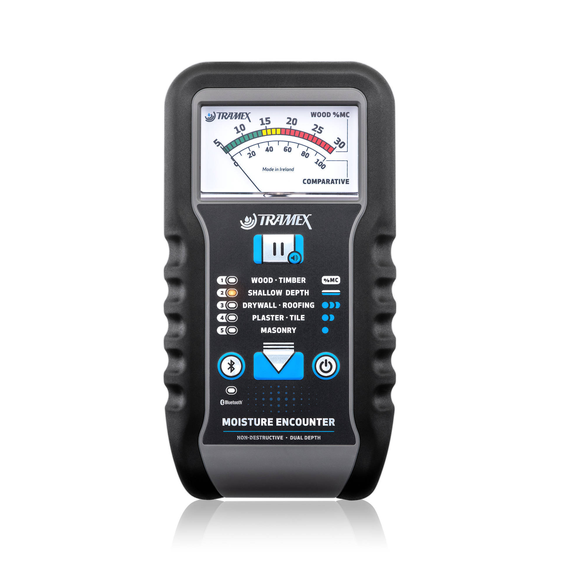 Moisture readings can be visualized with the Tramex Meters App and turned into moisture maps, reports and charts for sharing. Bluetooth connectivity to mobile devices also helps to GeoTag test results, create, save and share photos.