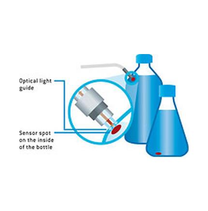 The non-invasive optical oxygen sensors measure the partial pressure of both dissolved and gaseous oxygen. These sensor spots are used for glassware and disposables. The sensor spots are fixed on the inner surface of the glass or transparent plastic material. The oxygen concentration can therefore be measured in a non-invasive and non-destructive manner from outside, through the wall of the vessel. Different coatings for different concentration ranges are available. Features