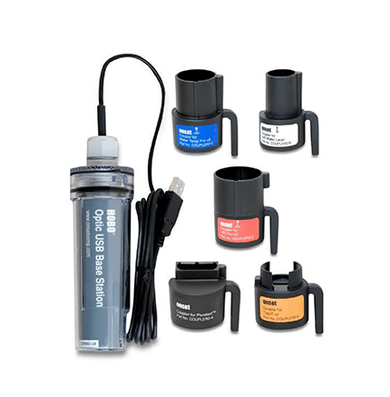 A splash-resistant base station and couplers used to offload data from any HOBO data logger with an Optic USB interface.