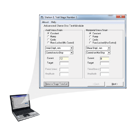 Independent control over the axial axis (load, stress or strain) and shear axis (load, stress or strain) with constant, ramp or quasi-static sinusoidal cyclic control on either axis. Unsaturated tests may be performed using the axis translation technique. Note: PC needs to be running GDSLAB.