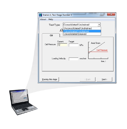 Constant rate of strain control for unconsolidated undrained (UU), consolidated undrained (CU) and consolidated drained (CD) shearing tests. Note: PC needs to be running GDSLAB.