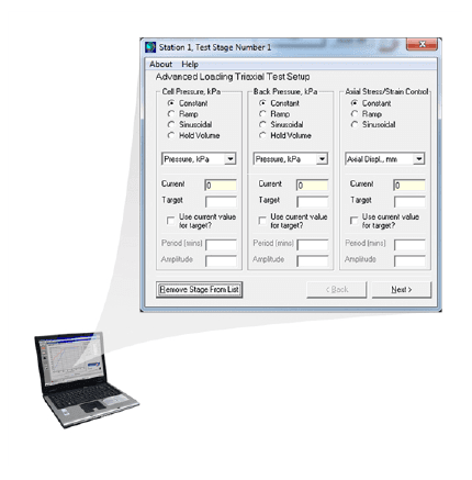 Independent user control over the axial (load, stress or strain), radial and back pressure axes with control options of constant value, ramp or quasi-static sinusoidal cyclic applied separately to each axis. Note: PC needs to be running GDSLAB.