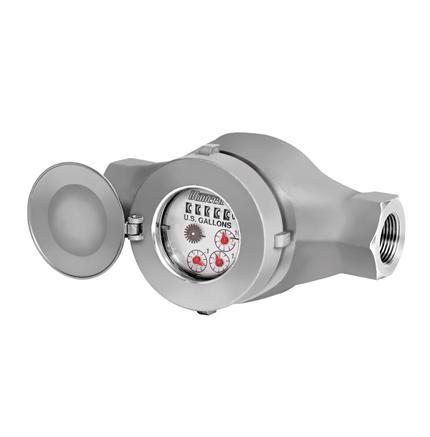 The Series 900 features interchangeable inlet inserts with three different sized orifices. The orifices are pre-calibrated for specific low, medium and high flow ranges of the meter. Fluid enters the inlet port and passes through the pre-selected orifice into the cylindrical measuring chamber. Here, the flowing fluid is separated into two streams, rotating a vaned impeller at a speed directly proportional to flow rate. The impeller is connected to a meter register through a magnetic drive assembly. Each impeller rotation is mechanically tabulated and displayed by the register atop the meter.