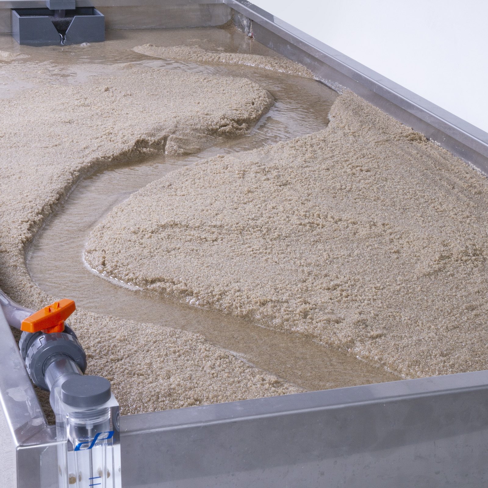 The water then flows through the sand where the formation of meandering channels, point bars, cut banks, riffles, thalwegs etc. can be observed and analysed.