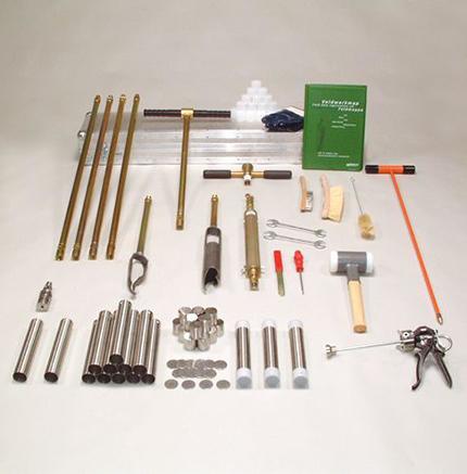 The set contains among other things: an Edelman auger to pre-bore or clean the bore hole, in various types of soil, a stainless steel soil coring apparatus with a number of sample tubes, filling blocks and insulation plates. Further bottom caps, a sample extruder and maintenance material. The complete set is packaged in an aluminum transport case. It is possible with this set to take samples to a depth of more than 5 meters.
