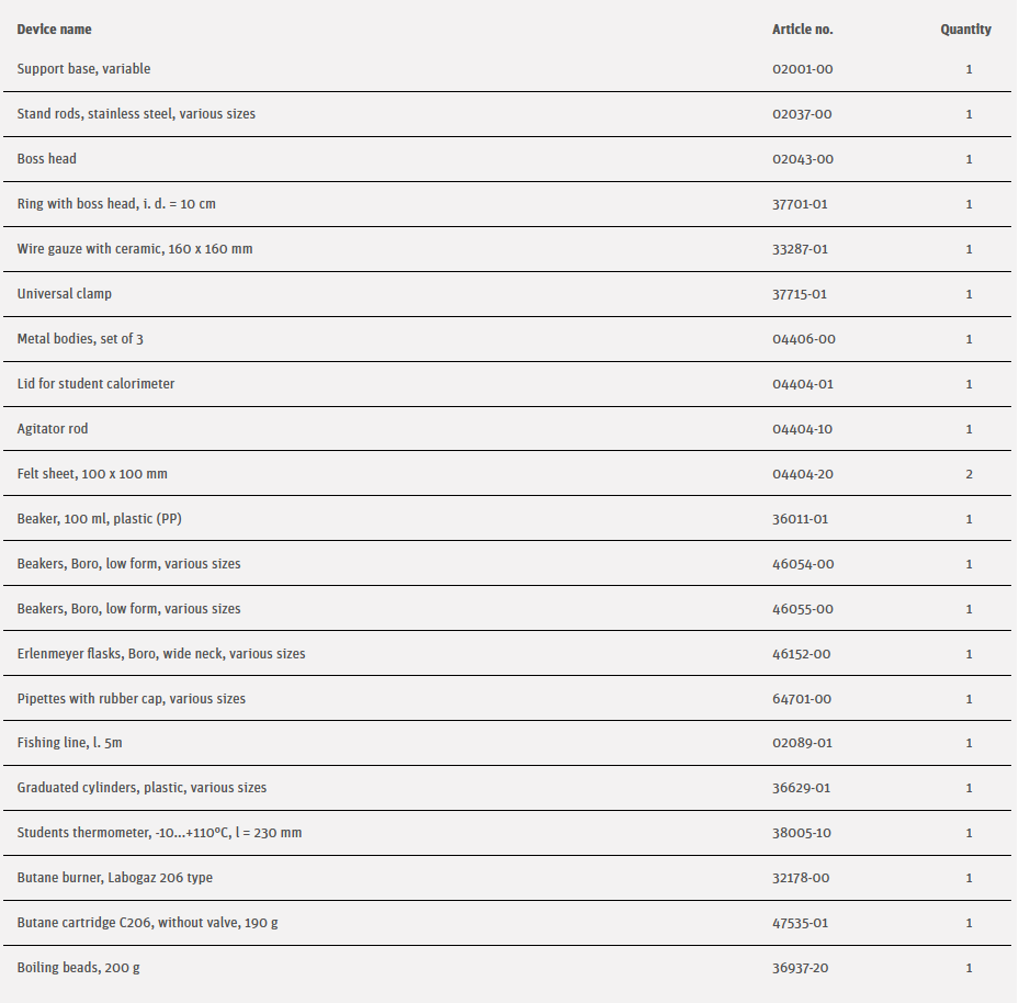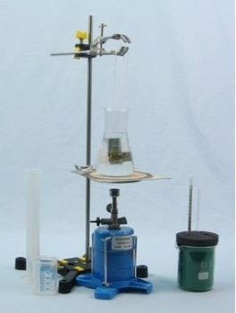 Three metal bodies having the same mass are heated in boiling water and then successively placed in a calorimeter. Even from just the measured mix temperatures it is possible to make qualitative conclusions as to the size of the storage ability (heat capacity) of the metals. The specific heat capacity of solid bodies is calculated from the released heat.