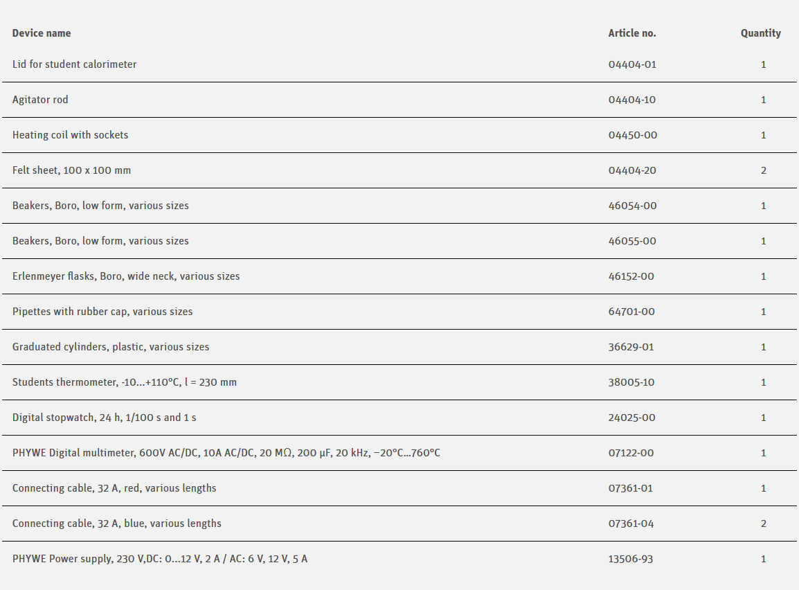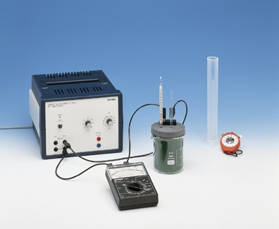 A measured quantity of water is heated with a heating coil. The electrical heat output is determined. From the temperature increase and the heat energy, the specific heat capacity of water is calculated. This calculation is performed under point 6 of “Evaluation”, i.e. determination of the average value of the individual measurements. Optionally, this evaluation point can be skipped and the method in the supplementary problem can be used instead.