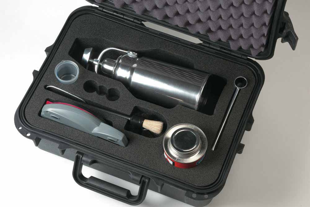 The test system uses the reaction between water and calcium carbide forming a gas. Complete with electronic balance and accessories; the whole is contained in a portable moulded case, but without reagent tin.