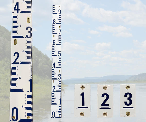 Designed to the specifications of Water Survey of Canada, the gauges are manufactured from 18 gauge plate steel which is then porcelain coated to resist rust and discoloration. Slotted brass eyelets allow the gauge height to be adjusted during mounting.