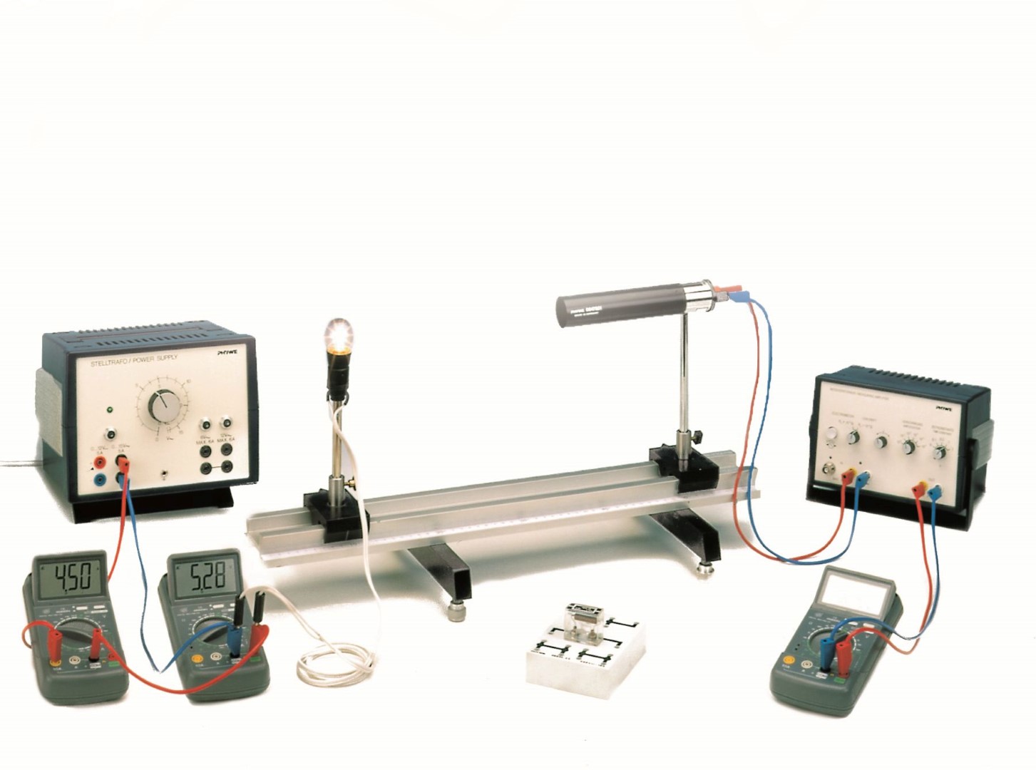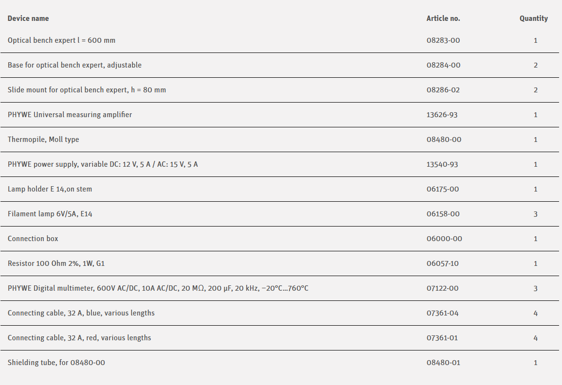 According of Stefan-Boltzmann’s law, the energy emitted by a black body per unit area and unit time is proportional to the power “four” of the absolute temperature of the body. Stefan-Boltzmann’s law is also valid for a so-called “grey” body whose surface shows a wavelength independent absorption-coefficient of less than one. In the experiment, the “grey” body is represented by the filament of an incandescent lamp whose energy emission is investigated as a function of the temperature.