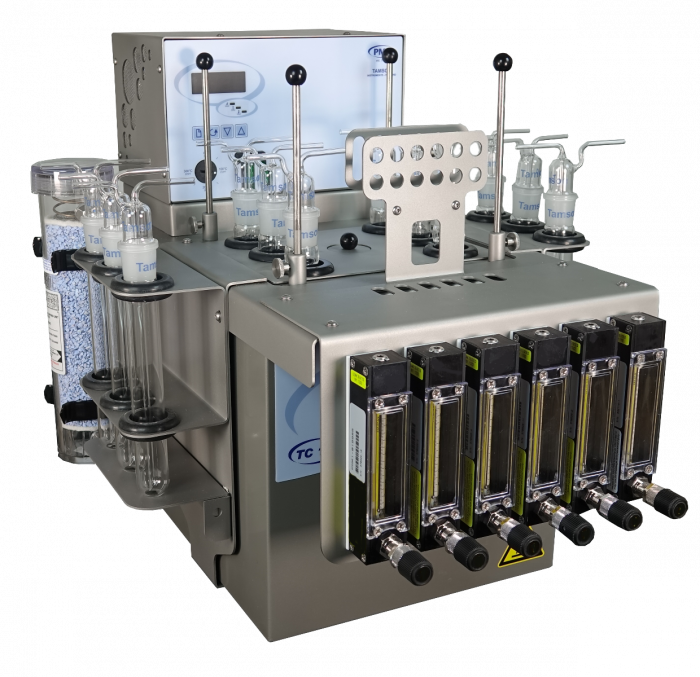 The Tamson ASTM D2440 apparatus is an excellent solution for determining the Oxidation Stability of Mireal Insulating oil conform ASTM D2440. Tamson can supply the apparatus with the prescribed glassware and six positions for ageing of the sample.The Tamson ASTM D2440 apparatus consists of one liquid bath equipped with six sets of calibrated flowmeters and six sets of glassware. The flowmeters have a fine adjustable needle valve, to ensure the correct amount of oxygen is supplied. A dryer tower is also supplied and can be mounted on the side of the bath.