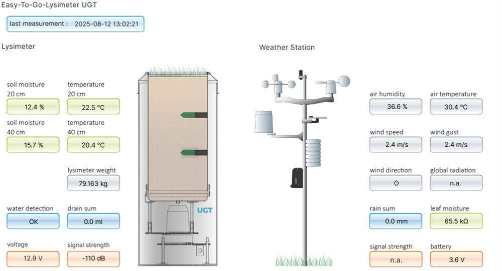The data is continuously transmitted to your individual SVADSS data management portal via NB-IoT wireless technology. All ETGs are suitable for both disturbed (manual filling) and undisturbed soil monoliths (special sampling technology). The ETG lysimeter station can be set up and put into operation without special tools and even without trained UGT personnel.