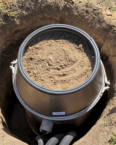 In addition to weighing, our ETG lysimeters are equipped with high-resolution soil moisture and soil temperature probes (SMT-100). Soil moisture is measured in volume % water content and is an important parameter in the water balance of the soil monolith. In addition, the free outlet at the bottom of the monolith and the automatic submersible pump at the bottom of the outer vessel enable quantitative and qualitative investigations of the seepage water.