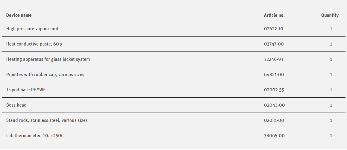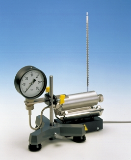 The high-pressure steam apparatus makes it possible to measure steam pressure in a temperature range of 100-250 °C. This allows for investigations to be performed on real gases and vapours. Typical equilibrium states between gas and liquid phases can be set up. For this purpose, water is heated in a closed pressure chamber at constant volume. The heat of vaporisation is determined at various temperatures from the measurement of vapour pressure as a function of temperature.