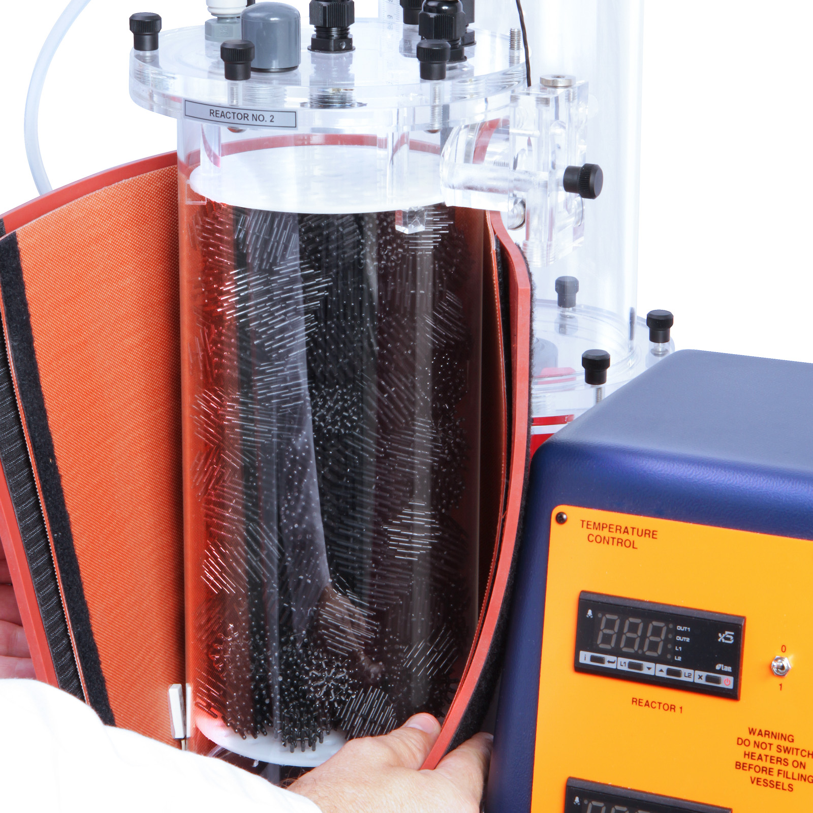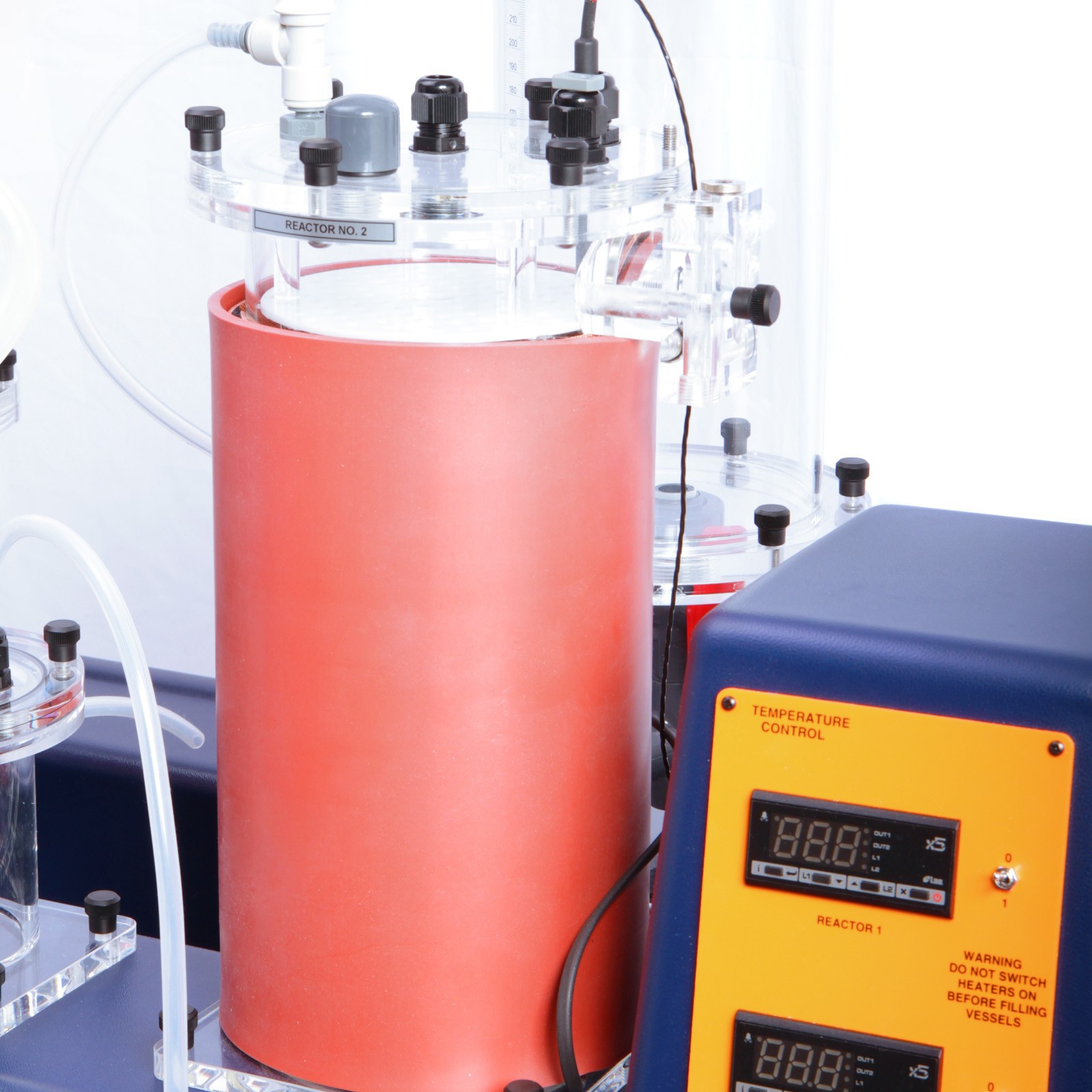 The temperature of each reactor is controlled by an electric heating mat wrapped around the external wall. The temperature distribution within each reactor is maintained to ±0.5°C. Reactor temperatures may be separately set at any desired value in the range ambient to 55°C.